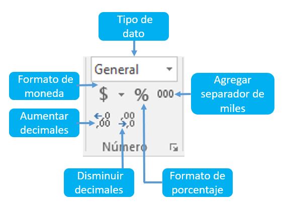 Dentro de la Barra de herramientas o Cinta de Opciones, ubicada en la pestaña inicio, se encuentra el grupo Numero, donde es posible identificar los siguientes íconos.